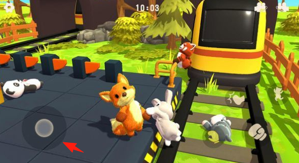1、場景互動在卡通森林、火車站地圖,操控動物(狐貍、兔子、考拉),利用場景道具(火車、圍欄)。