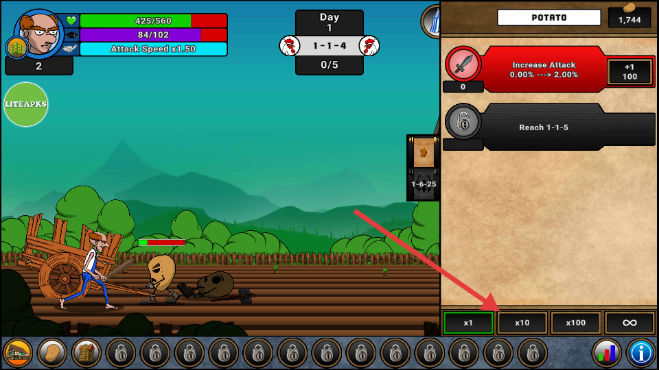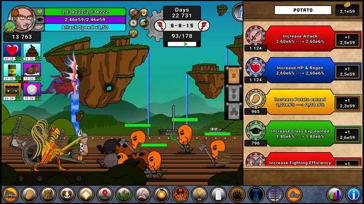 1、用土豆和骷髏貨幣升級(jí)30多種屬性,把鋤頭掄出加特林的效果。