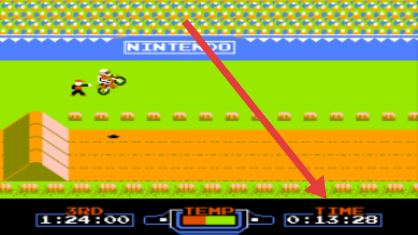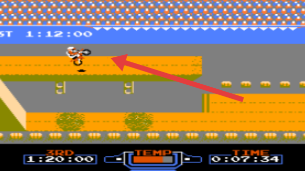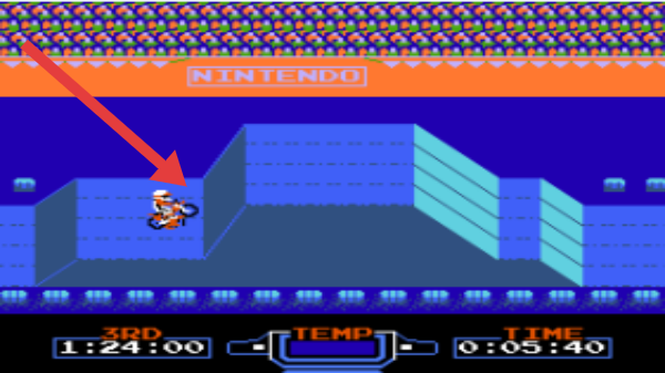 2、進(jìn)入藍(lán)色“NINTENDO”賽道,駕駛摩托(箭頭指向),穿越凹地,控制平衡,降低溫度(TEMP)。
