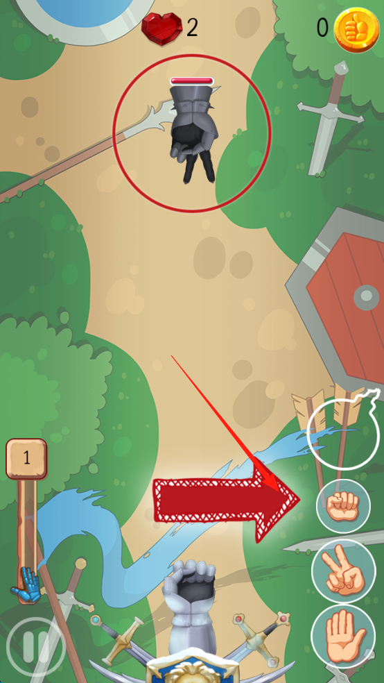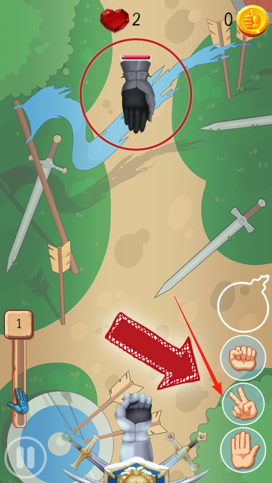 2、按箭頭方向移動,接近敵人,根據(jù)情況,點(diǎn)擊對應(yīng)手勢(如剪刀)互動。