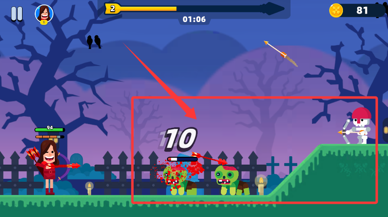 2、進(jìn)入關(guān)卡,操控角色用弓箭精準(zhǔn)射擊僵尸等敵人,但需留意血量與時(shí)間。