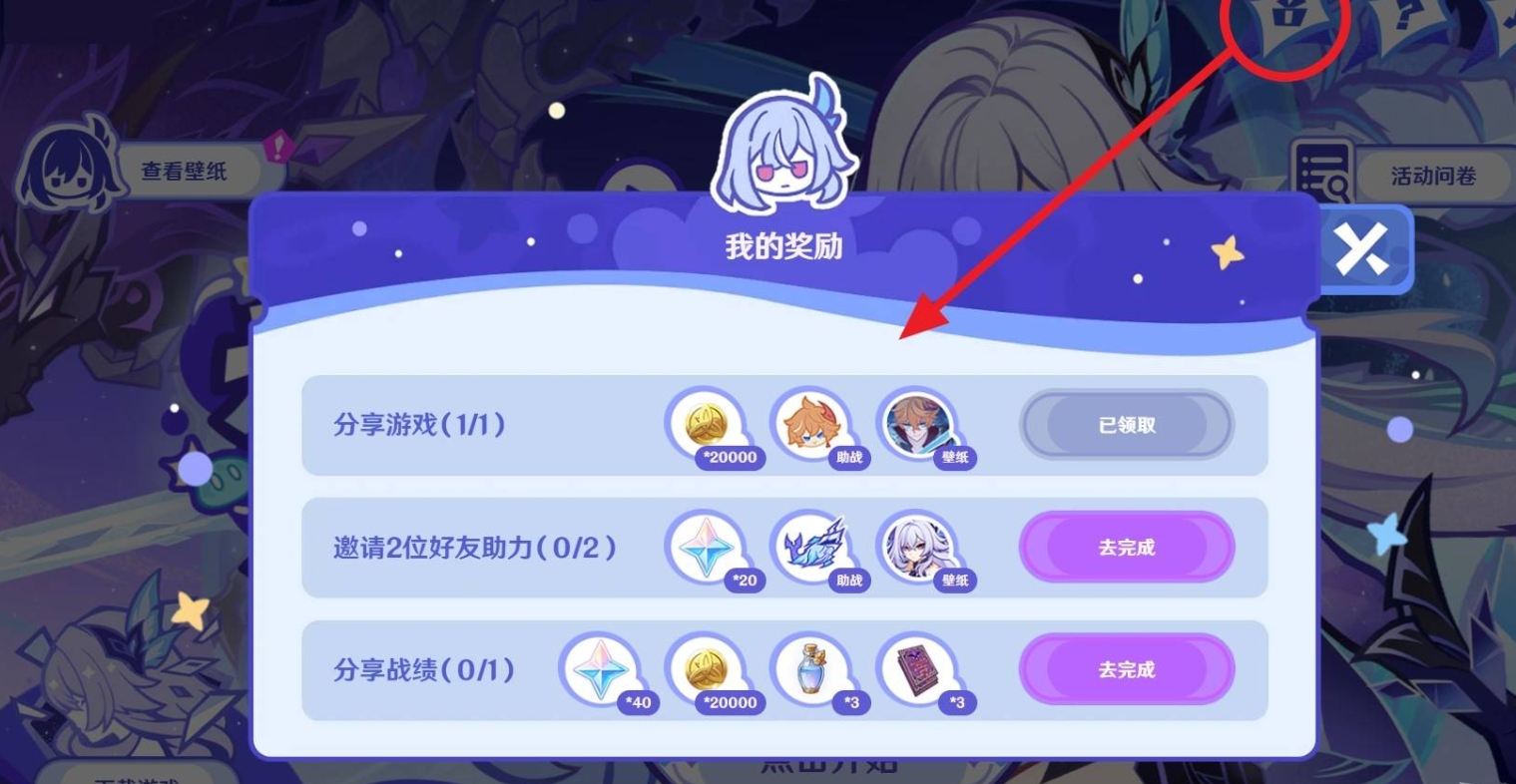 1、進(jìn)入活動頁面,點(diǎn)擊右上角禮物圖標(biāo),完成【分享游戲】任務(wù),領(lǐng)取摩拉、達(dá)達(dá)利亞助戰(zhàn)及活動壁紙,開啟活動流程。