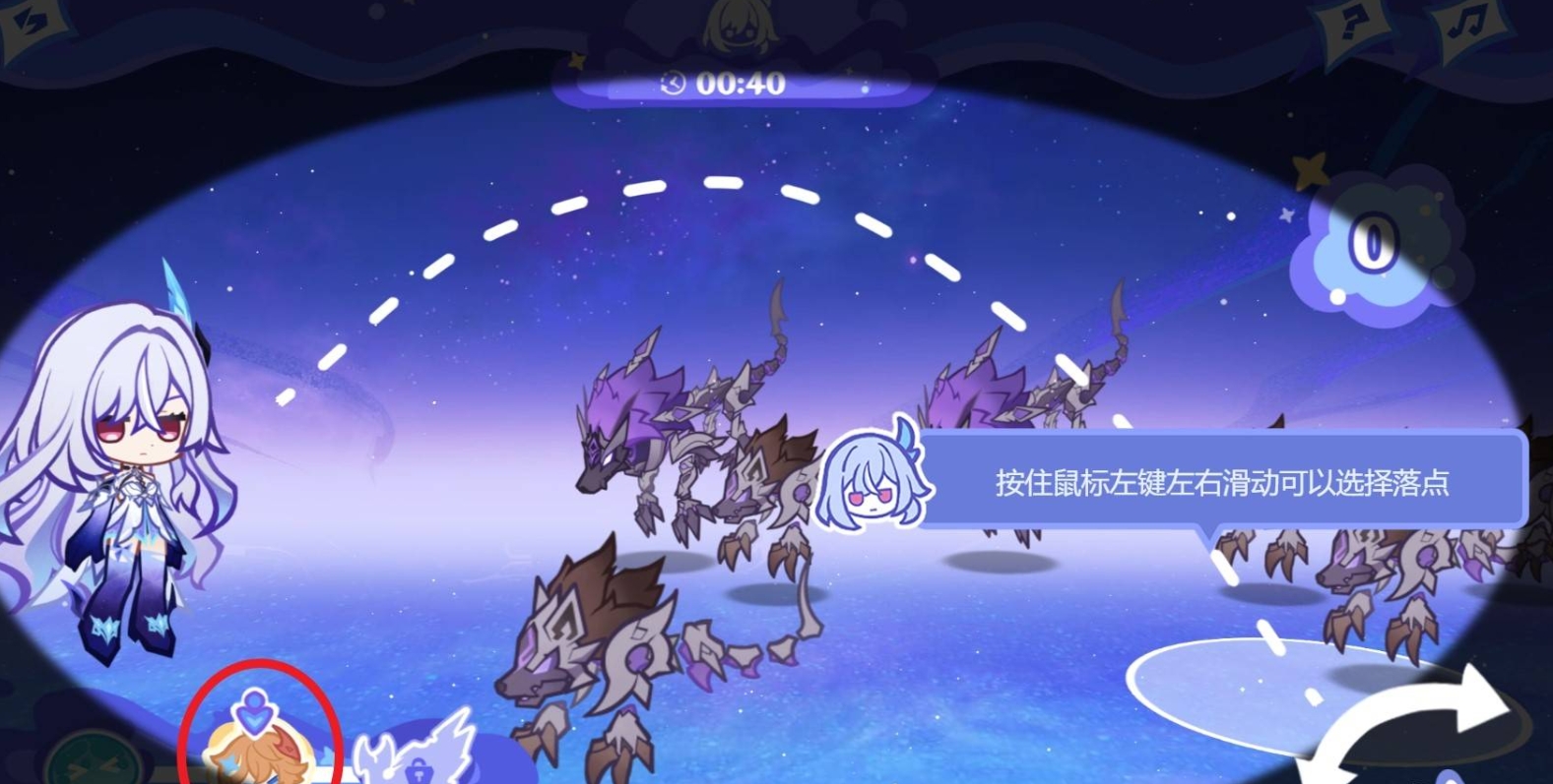 3、進(jìn)入戰(zhàn)斗按住鼠標(biāo)左鍵滑動選定落點(diǎn),操控絲柯克投擲攻擊獸境之狼,限時40秒內(nèi)作戰(zhàn),分享戰(zhàn)績可領(lǐng)40原石等養(yǎng)成道具。