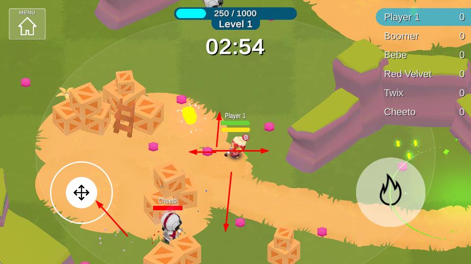 3、地圖中分布木箱、水晶等資源,靠近可互動獲取;借助地形隱藏、迂回,規(guī)避敵人攻擊,或伏擊對手。