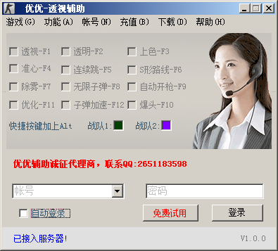 優(yōu)優(yōu)槍林彈雨輔助是專為游戲《槍林彈雨》打造的輔助工具。軟件功能強(qiáng)大,提供透視、上色、連續(xù)跳、準(zhǔn)心、無(wú)限子彈、自動(dòng)開槍、爆頭等功能,讓你一槍一個(gè)爆頭,秒變大神!趕快下載體驗(yàn)吧!
