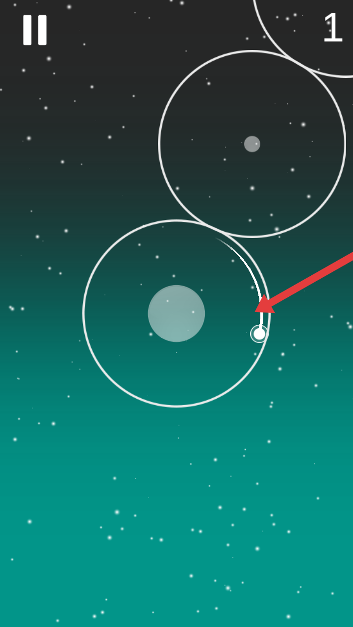 2、操控白色小球沿軌道繞中心天體運(yùn)動(dòng),保持小球始終在白色圓環(huán)區(qū)域內(nèi)穿梭,規(guī)避邊界碰撞,右上角數(shù)字為當(dāng)前積分。