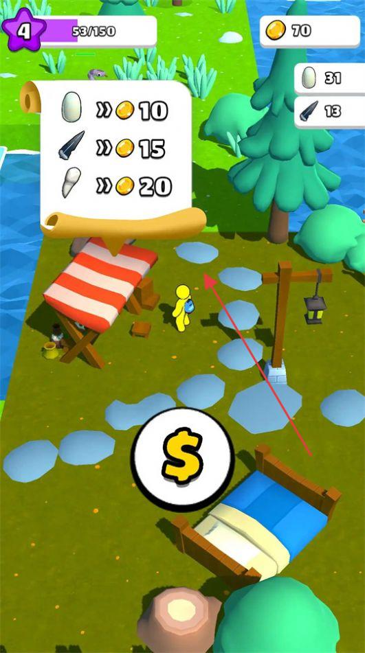 1、收集蛋、尖牙等物品,到對(duì)應(yīng)攤位兌換金幣,升級(jí)角色,建造營地。