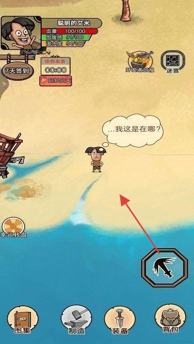 3、在沙灘場景,用工具采集,制造裝備,探索迷宮,完成生存挑戰(zhàn)。