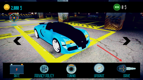 1、主界面選【DRIVE】駕駛模式,進(jìn)入車庫選藍(lán)色跑車,準(zhǔn)備開始駕駛體驗(yàn)。