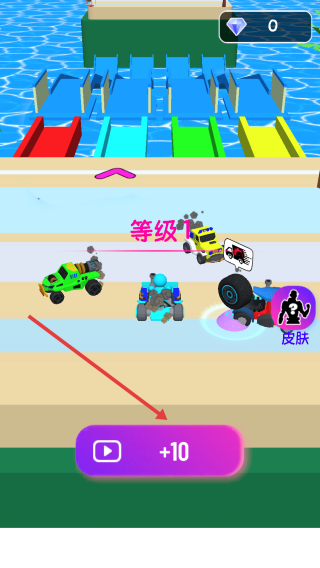 1、在選車界面,點【+10】看廣告獲獎勵,選藍(lán)色怪物卡車,準(zhǔn)備挑戰(zhàn)關(guān)卡1。