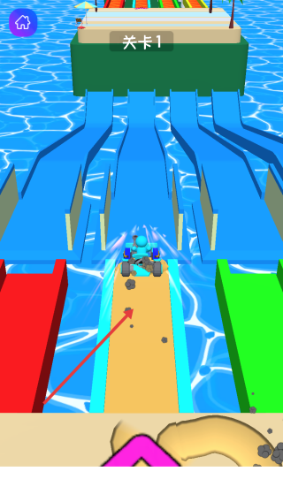 2、進(jìn)入關(guān)卡1,沿藍(lán)色賽道行駛,避障礙(如石塊),沖過彩色滑梯,保持速度。