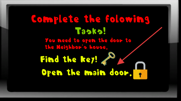 2、進(jìn)入任務(wù)界面,明確需完成的任務(wù),找到鑰匙并打開鄰居家的門,按指引推進(jìn)游戲流程。