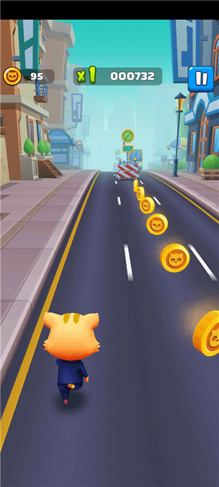 1、游戲中小貓將自動(dòng)奔跑,玩家通過(guò)左右滑動(dòng)屏幕切換跑道,避開(kāi)障礙并收集散落金幣與禮盒,完成跑酷任務(wù)。