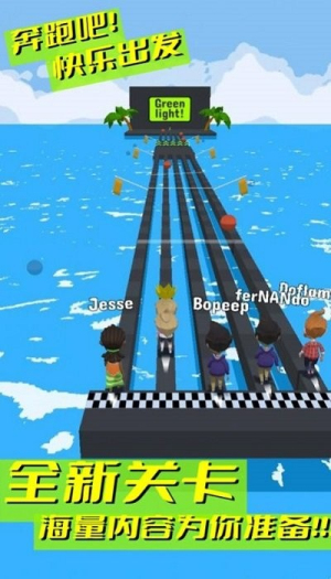 3、獨(dú)特的奔跑方式解鎖機(jī)制鼓勵(lì)玩家持續(xù)闖關(guān),通過積累解鎖新賽道和角色,提升游戲長期吸引力,增加游戲粘性。