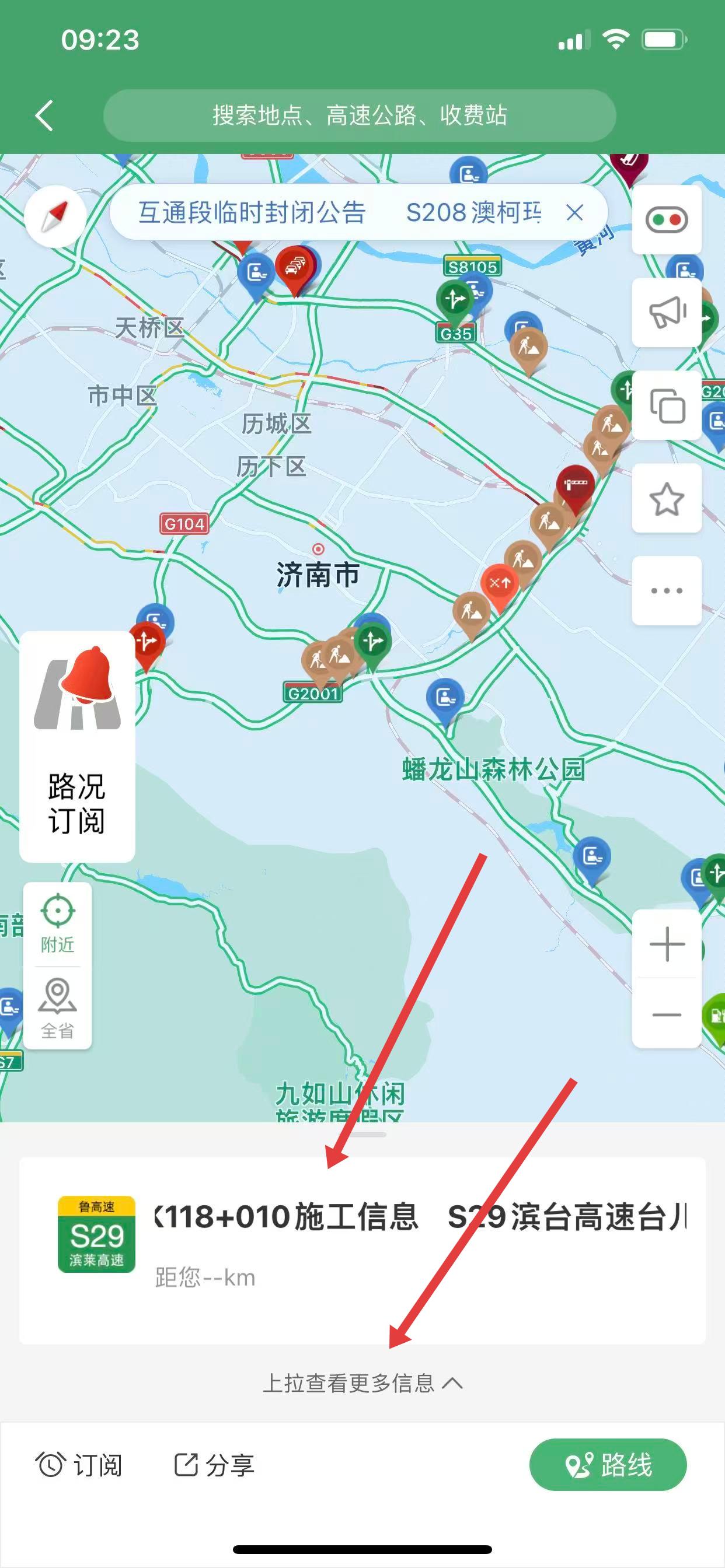 2、地圖顯示高速路段的路況信息,不同顏色代表不同路況,上拉查看更多信息。