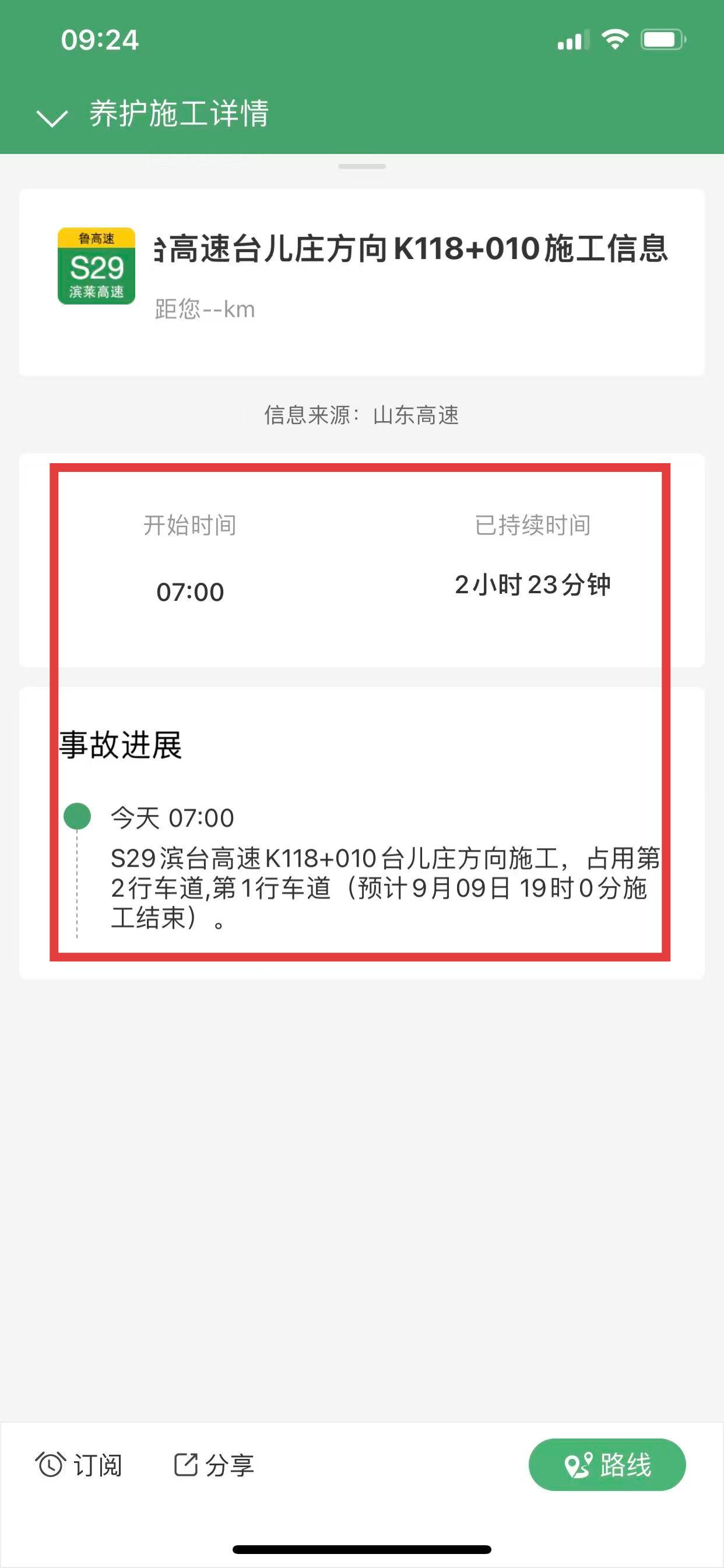 3、點擊具體的路況信息條后,會顯示養(yǎng)護施工詳情或事故詳情,包括開始時間、已持續(xù)時間、事故進展等信息。