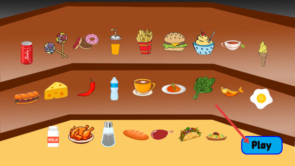 2、玩法開啟:在陳列各類食物的界面中點擊“Play”,跳轉(zhuǎn)至標注“Stage1”的餐廳場景,開啟互動挑戰(zhàn)。