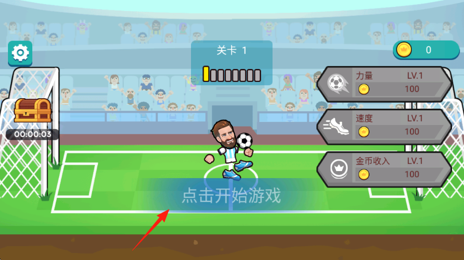 1、角色與屬性以卡通化足球運動員為主角,有“力量”“速度”“金幣收入”等屬性(均LV.1),在“關(guān)卡1”開場。