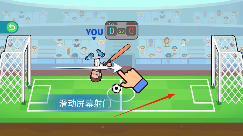 2、操作機(jī)制滑動屏幕控制射門,可借助道具(如棒球棍),調(diào)整角度、力度,讓足球避開對手(守門員)。