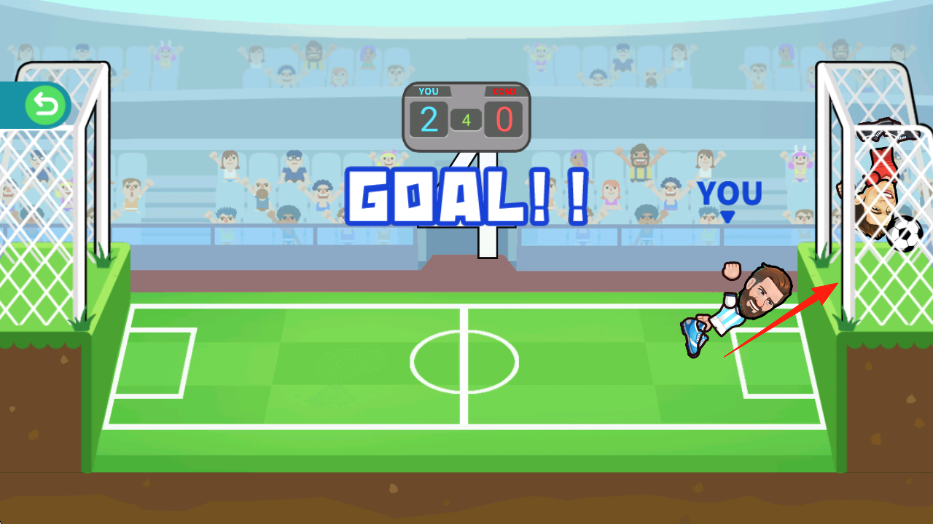 3、得分判定成功射門顯示“GOAL!!”,更新比分(YOU2:0OPP),推進(jìn)關(guān)卡,挑戰(zhàn)更高難度射門。