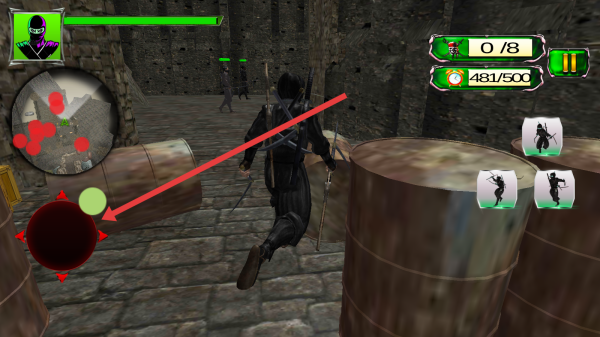 3、操控忍者,用左側(cè)搖桿(箭頭指向)移動(dòng),躲避敵人,按任務(wù)要求(0/8目標(biāo)),推進(jìn)流程。