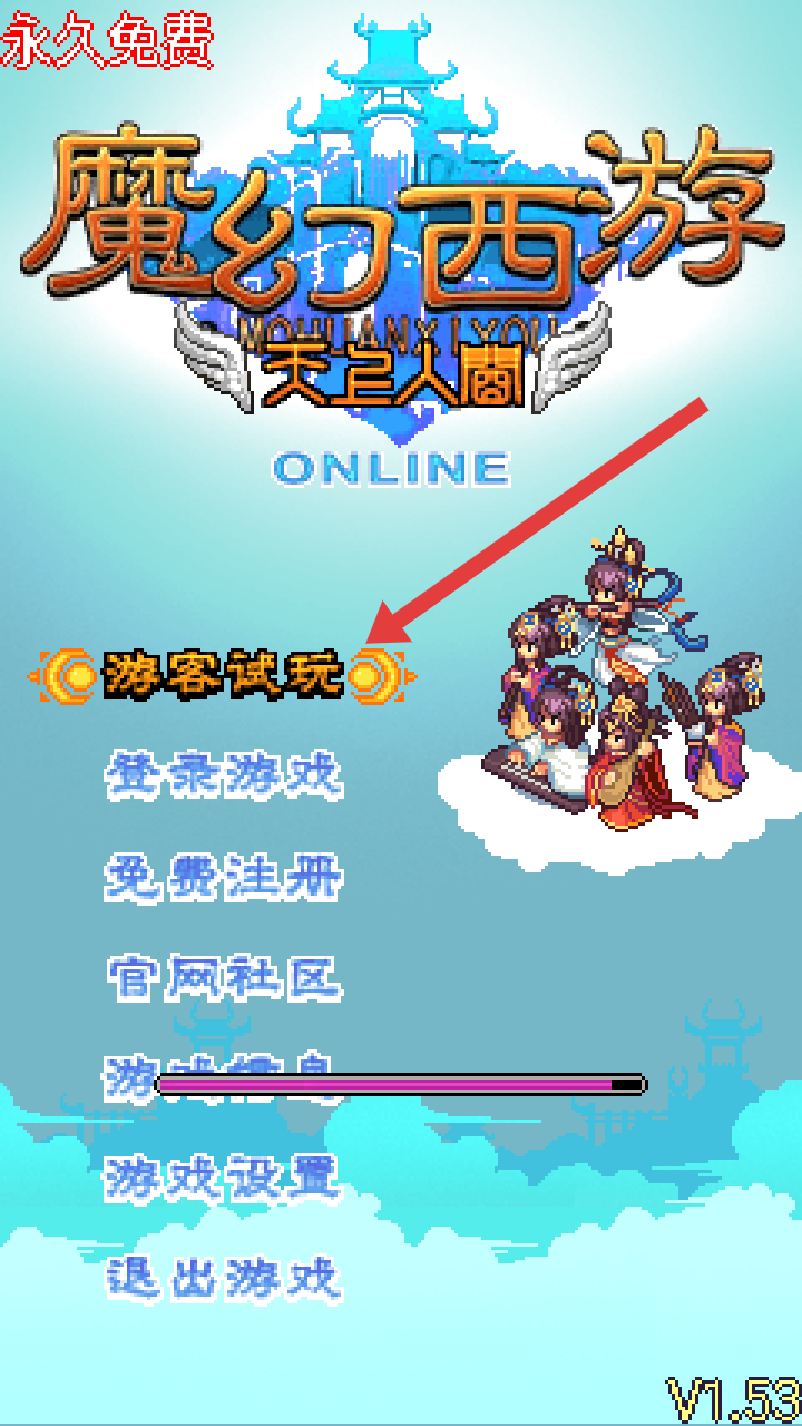 2、在魔幻西游的功能菜單中,點(diǎn)擊箭頭指向的【游客試玩】的選項(xiàng),快速體驗(yàn)游戲內(nèi)容。