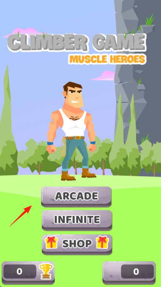 1、模式選擇主界面選“ARCADE(街機(jī))”“INFINITE(無限)”模式,或“SHOP(商店)”購道具,控制肌肉男角色開始攀巖。