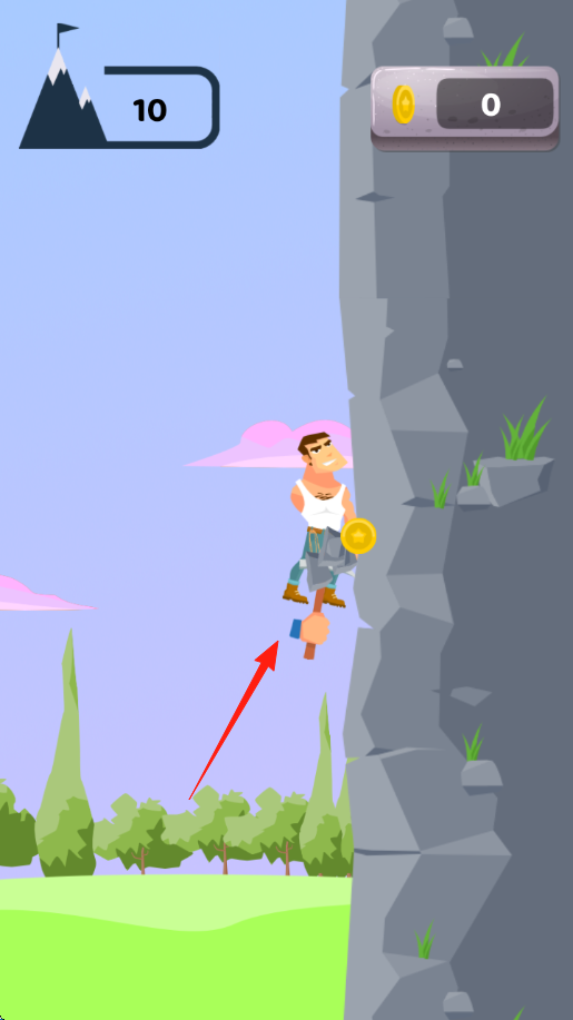 2、攀巖操作在巖壁場景,點(diǎn)擊屏幕讓角色揮斧抓巖點(diǎn),向上攀爬,收集金幣,界面顯示“10→11”關(guān)卡進(jìn)度,注意躲避障礙。