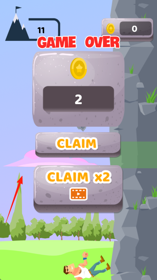 3、結(jié)算機(jī)制掉落觸發(fā)“GAMEOVER”,顯示獲得2金幣,可“CLAIM(領(lǐng)?。被蚩磸V告“CLAIMx2(雙倍領(lǐng)取)”,重新挑戰(zhàn)攀巖。