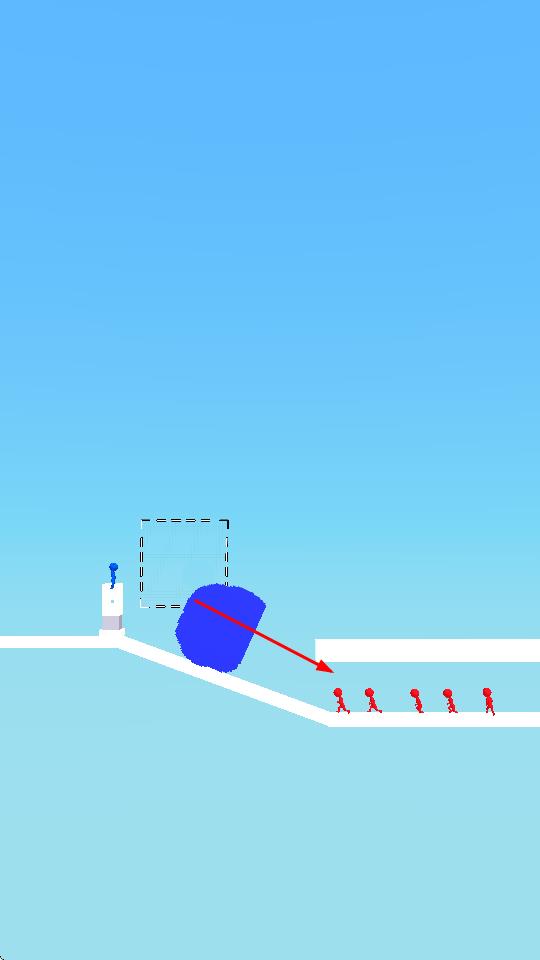 2、建造掩體時(shí),可讓巨石滾落,借助斜坡物理特性,撞擊、消滅路徑上的紅色小人,減少威脅。