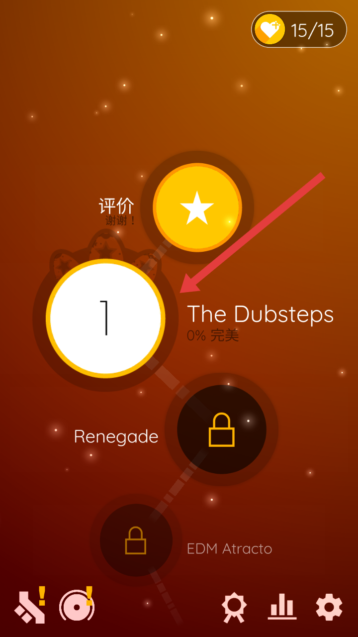 1、需要點(diǎn)擊選關(guān)界面箭頭指向的【The Dubsteps】關(guān)卡(標(biāo)“1”、0%完美),進(jìn)入游戲挑戰(zhàn)。