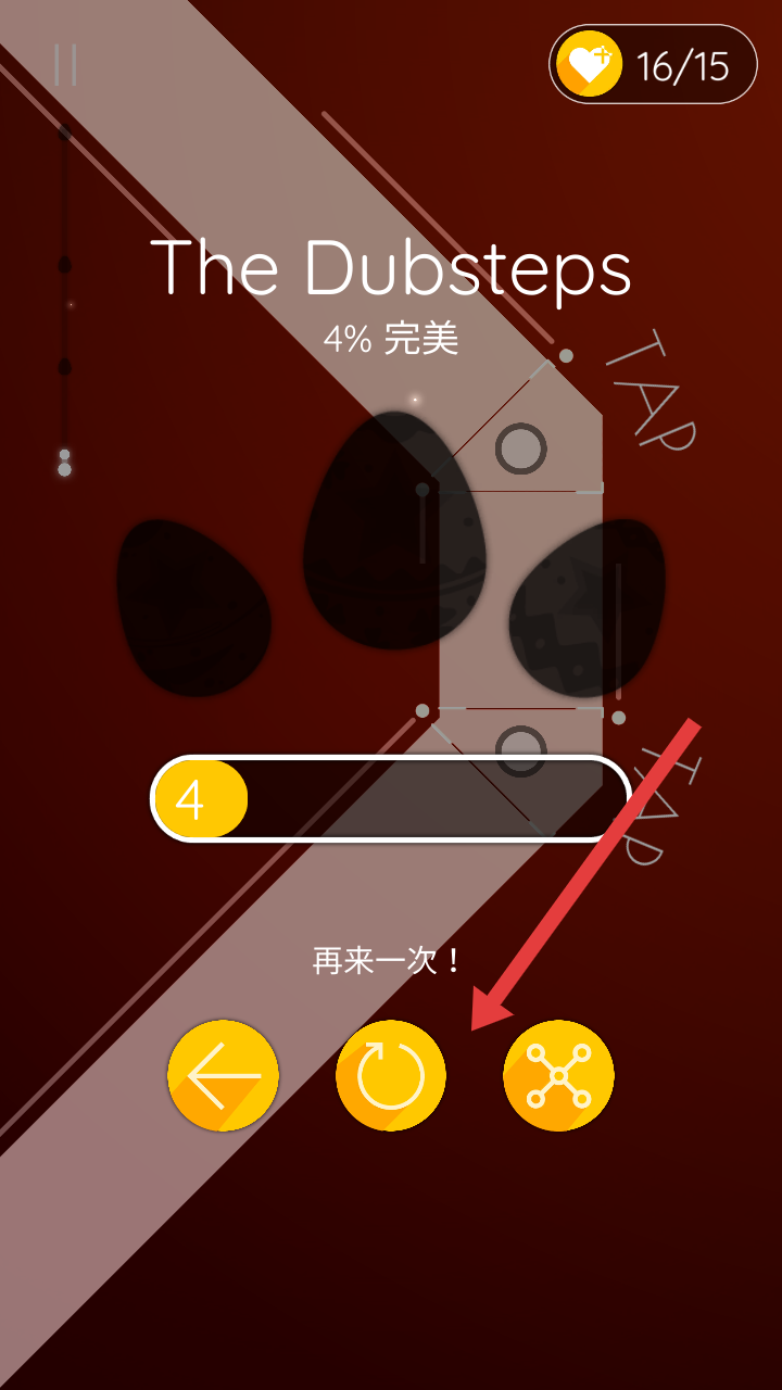 3、在結(jié)算的界面,點(diǎn)擊箭頭指向的黃色循環(huán)箭頭按鈕,重新挑戰(zhàn)【The Dubsteps】的關(guān)卡。