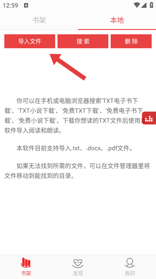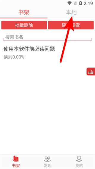 1、在應(yīng)用書架頁面,點(diǎn)擊本地選項(xiàng),進(jìn)入本地文件頁面。