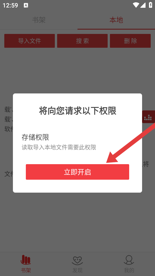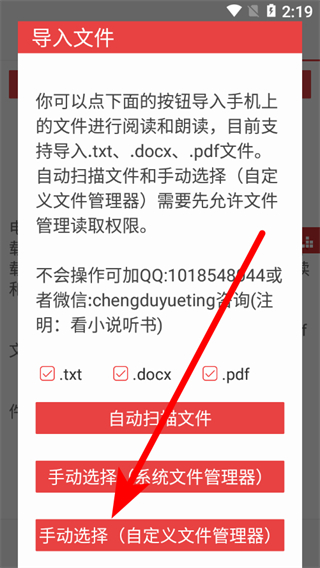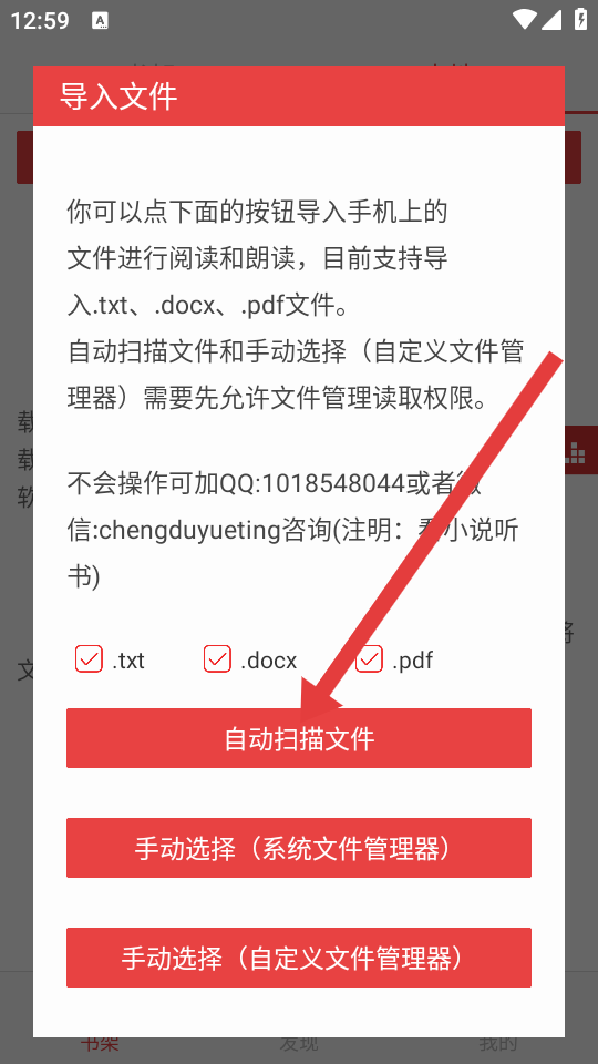 2、在導(dǎo)入文件選項(xiàng)窗口中,點(diǎn)擊自動掃描文件的按鈕,觸發(fā)存儲權(quán)限請求彈窗。
