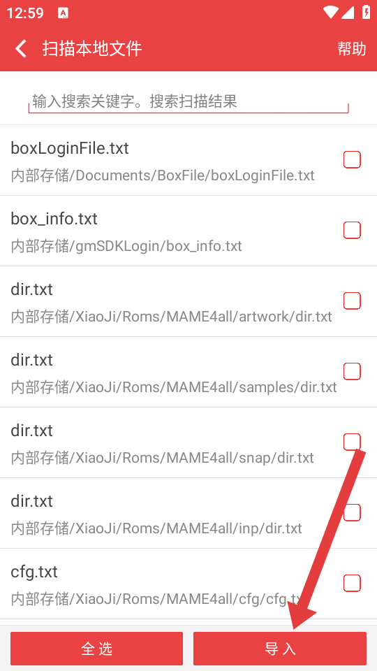 4、進(jìn)入掃描本地文件頁面后,勾選要導(dǎo)入的文件,點(diǎn)擊導(dǎo)入按鈕,完成文件導(dǎo)入操作。