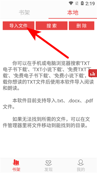 1、在看小說聽書的本地頁面,點(diǎn)擊導(dǎo)入文件的按鈕,彈出導(dǎo)入文件選項(xiàng)窗口。