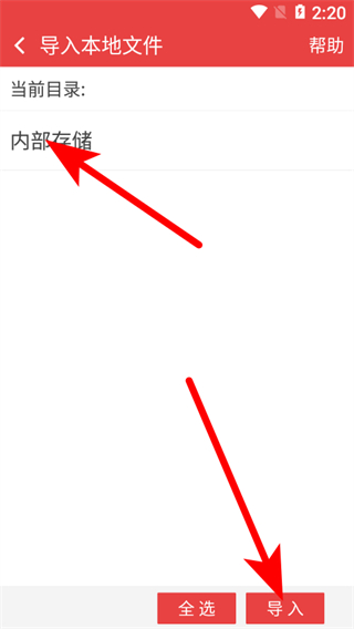 4、在文件目錄選擇頁面,選擇內(nèi)部存儲目錄,點(diǎn)擊導(dǎo)入按鈕,即可完成文件導(dǎo)入操作。