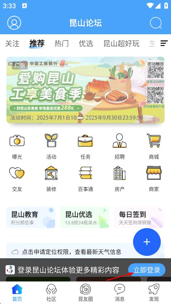 2、進入昆山論壇首頁,點擊立即登錄選項,進入登錄相關頁面。
