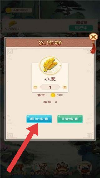 2、展示的是“農(nóng)作物”交易界面,其中可售賣“小麥”,有“原價出售”(售價100金幣、庫存3)和“5倍出售”選項,體現(xiàn)作物交易的玩法環(huán)節(jié)。