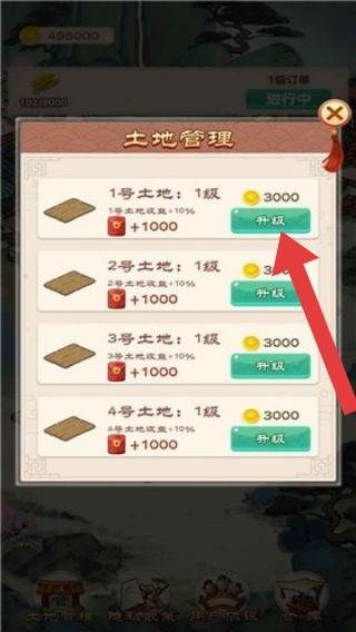 3、呈現(xiàn)“土地管理”界面,顯示1-4號土地均為1級,升級需3000金幣,升級后土地收益+10%,還有“1級訂單進(jìn)行中”等信息,是土地升級養(yǎng)成玩法的體現(xiàn)。