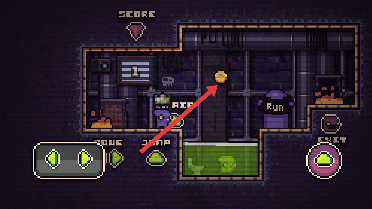 2、在像素囚徒Level1中,通過左側(cè)移動鍵、下方跳躍鍵操控角色,收集場景金幣,規(guī)避危險推進關(guān)卡進程。