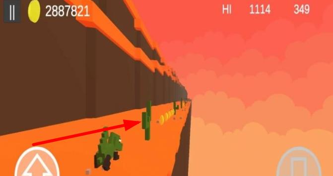 1、進(jìn)入界面通過虛擬操縱桿控制霸王龍左右移動,點擊跳躍鍵越過初始仙人掌障礙,收集沿途金幣。