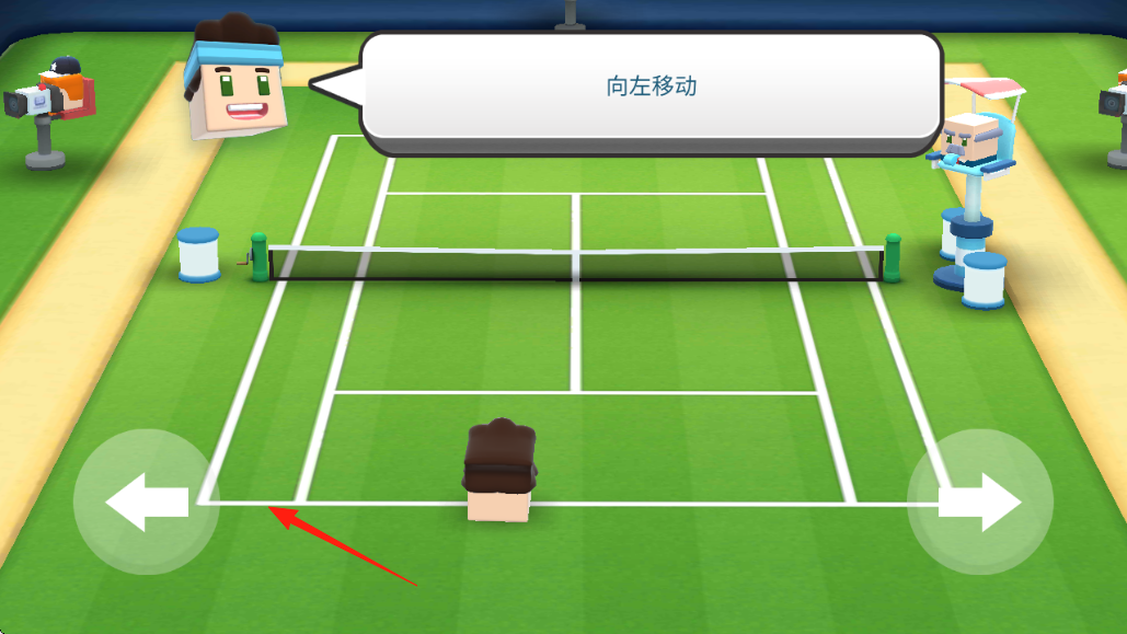 2、移動(dòng)操作在綠色網(wǎng)球場,按提示“向左移動(dòng)”,用左右箭頭按鍵,控制角色跑位,準(zhǔn)備接球。