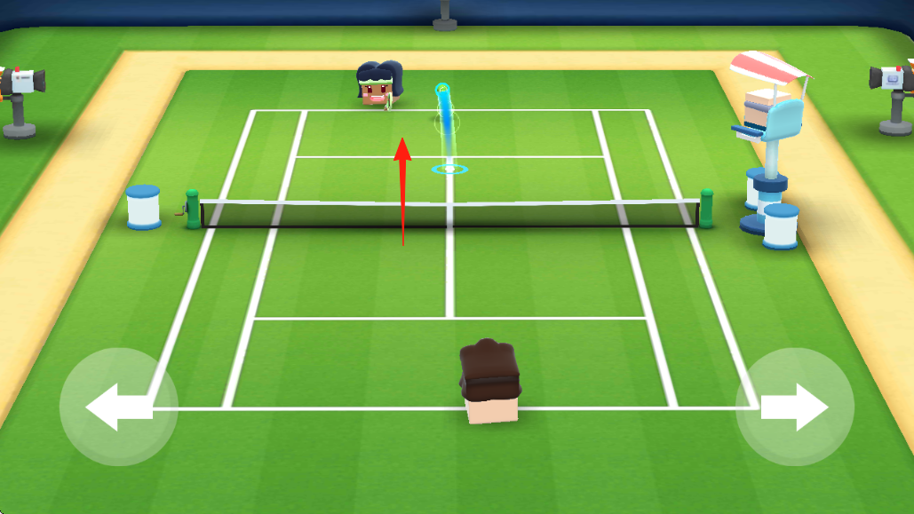 3、擊球?qū)诡A(yù)判球路(綠色軌跡),移動(dòng)角色至落點(diǎn),點(diǎn)擊擊球,與對(duì)手來回對(duì)打,爭取得分。