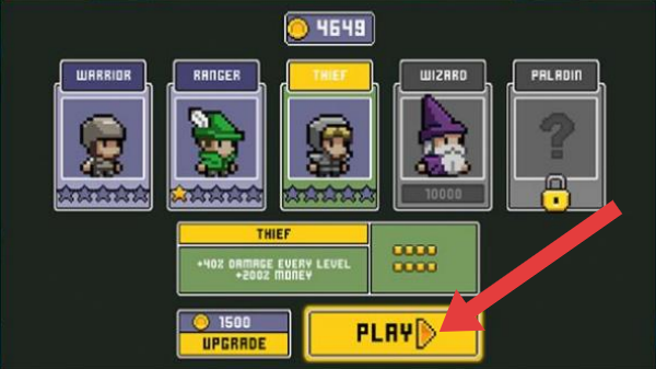 1、上方顯示金幣數(shù)量4649,下方有“1500UPGRADE(花費(fèi)1500金幣升級)”【PLAY(開始游戲)】按鈕,呈現(xiàn)角色選擇與開局準(zhǔn)備界面。