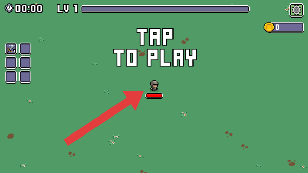 2、左側(cè)武器/道具欄、右上角齒輪、金幣顯示,中間【TAPTOPLAY(點(diǎn)擊開始游戲)】文字,紅色箭頭指向角色(帶血條的像素小人),呈現(xiàn)初始可操作狀態(tài)。