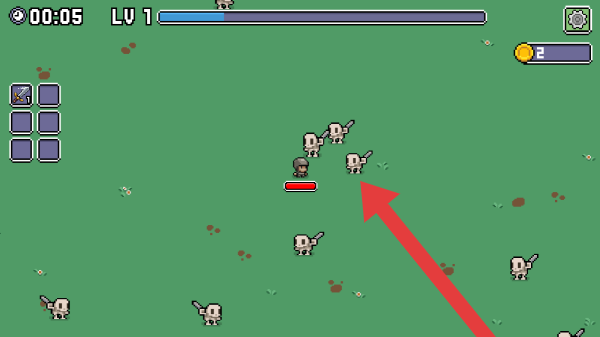 3、玩家操控的像素小人(帶血條),周圍是持武器的骷髏敵人,呈現(xiàn)戰(zhàn)斗場景,角色處于1級開局戰(zhàn)斗階段。