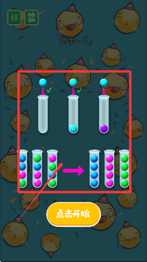 4、游戲的核心目標(biāo)是把所有相同類型的表情符號(hào)集中到同一個(gè)試管中,成功完成這一目標(biāo)即可通關(guān)并解鎖下一關(guān)卡。