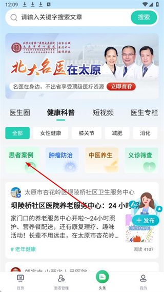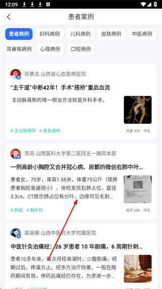 2、在頭條頁面,點擊患者案例板塊,進(jìn)入患者案例分類頁面。