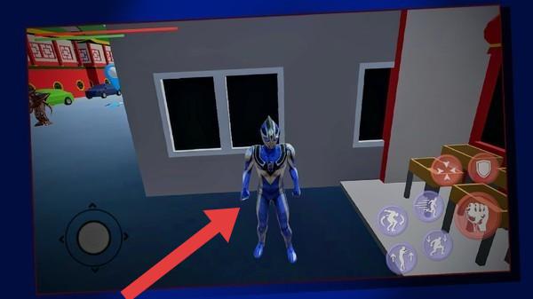 2、畫面中是藍白色造型的奧特曼角色,處于室內場景,右側有技能操作按鍵,屬于奧特曼主題的動作冒險,玩家可操控奧特曼行動、戰(zhàn)斗。